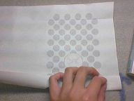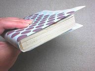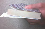 ■ブックカバーのきれいな折りかた![]() 1.印刷したブックカバーを裏返して置きます。 表紙側の茶色い水玉が右手に来るようにします。 ![]() 2.茶色の水玉の上に本を置きます。お好きな位置で微調整してください。 ![]() 3.本の縁に沿って折り目をつけます。 ![]() 4.上下とも折り目を付けたらこんな感じ。 折り目のところを赤線で示してあります。 ![]() 5.つけた折り目に沿ってブックカバーを折ります。 このとき、紙の端をきれいに合わせて折ると、出来上がりのカバーが歪みません。 ![]() 6.上下両方折るとこんな感じ。 ![]() 7.カバーを縦置きにします。茶色い水玉が向こう側。 茶色い水玉が隠れるように本を置きます。 ![]() 8.本をくるむように、カバーを半分に折ります。斜めから見たらこんな感じ。 本の背にできるだけぴったり沿わせてください。 ![]() 9.ひっくり返して茶色の水玉が見える面を表にします。 ロゴが真ん中にくるように微調整しながら、本の縁に沿って折り目をつけます。 ![]() 10.つけた折り目にそって、カバーを折り込みます。横から見たらこんな感じ。 ひっくり返して裏表紙も同じように折り込みます。 ![]() 11.できあがり。 お好みで、折り返した部分に本の表紙を差し込んでください。 カバーが外れにくくなります。 | |